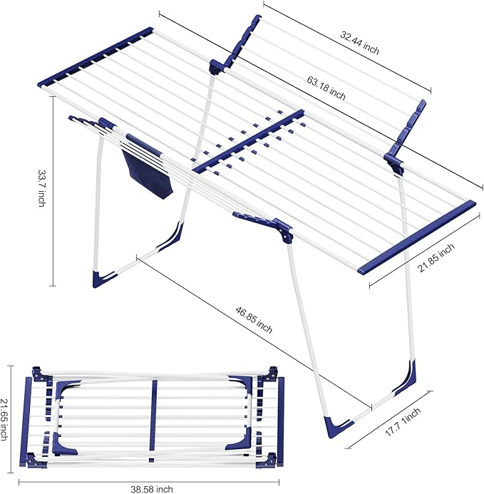 - Maximize Drying Space: The APEXCHASER clothes drying rack offers a generous drying space, measuring 63.217.733.7 inches, with 24 hanging rods, 10 clips, and 1 clip bag. The 2.4 inch spacing between rods gives efficient drying and accommodates all kinds of clothes easily.