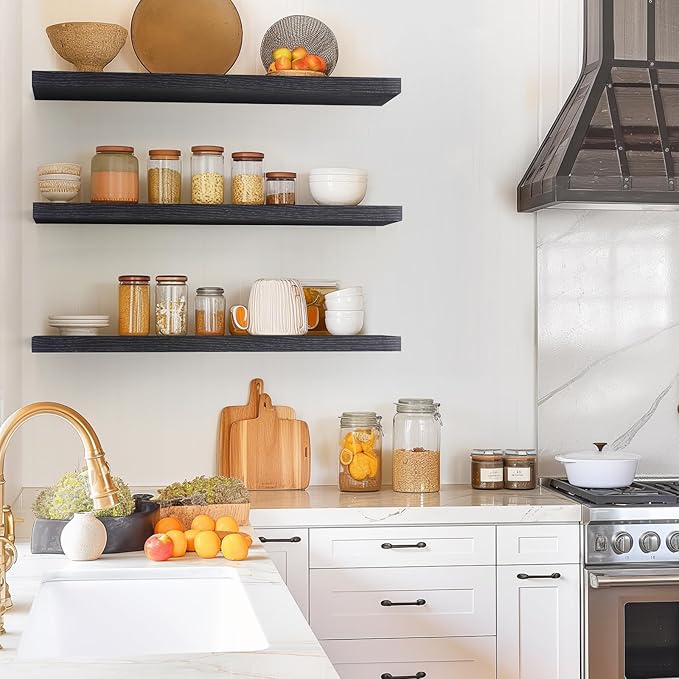 BAYKA Floating Shelves for Wall, 36 inches Long Wall Mounted Rustic Wood Shelves for Bathroom, Bedroom, Living Room, for Books/Storage/Decor with 30lbs Capacity๏ผBlack,Set of 3