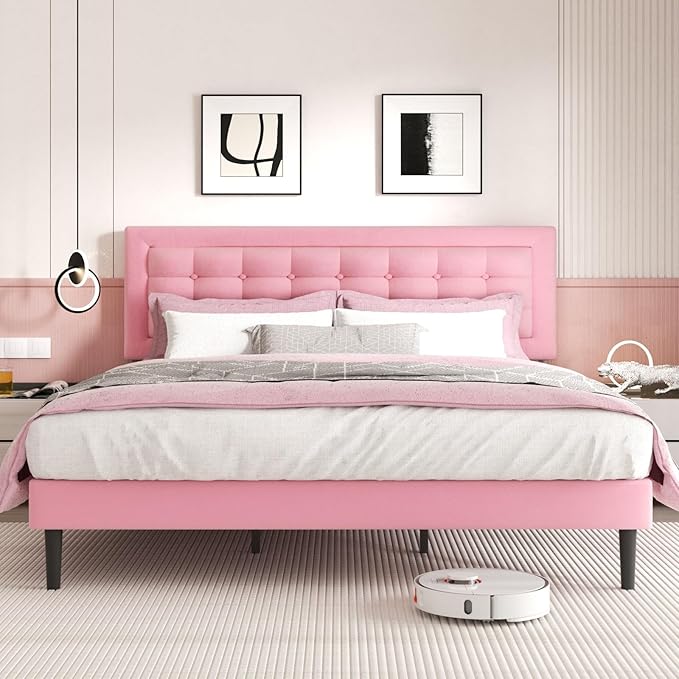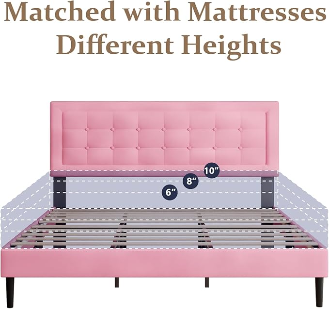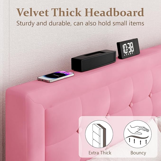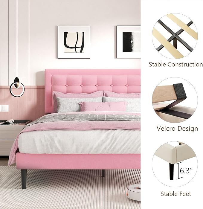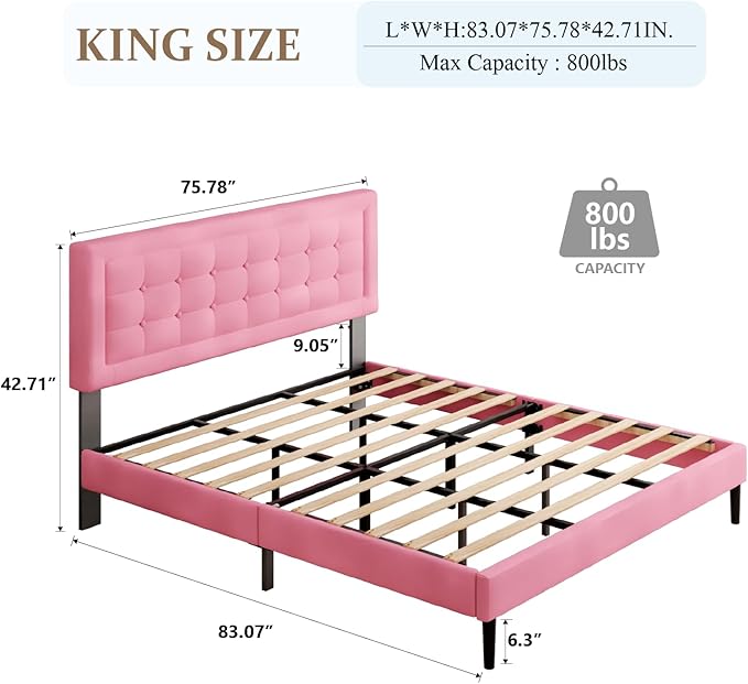 King Size Bed Frame with Headboard, Platform Bed Frame with Velvet Upholstered Button Tufted Headboard, Wood Slats Support, No Box Spring Needed, Mattress Foundation, Easy Assembly, Pink