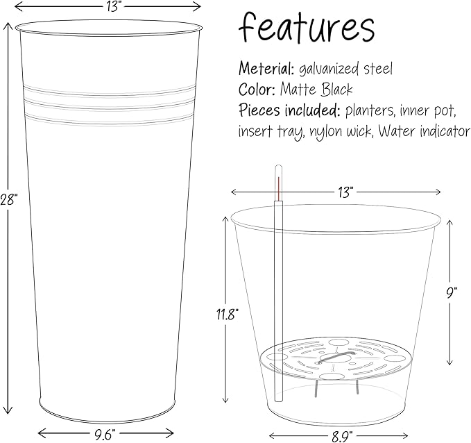 KOL 28'' Tall Galvanized Steel Planter Pot - Flower Pot with Water Level Indicator for Plants - 2-Pack Self Watering Planters - Round Black Powder Metal Planter Box - Indoor Outdoor Grande Plant
