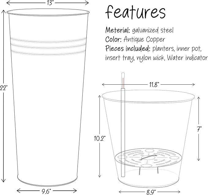 KOL 22''H 2-Pack Planter with Water Level Indicator - Galvanized Steel Pot - Self Watering Planters Flower Pot for Plant - Inner Pot Design - Round Metal Planter Box - Indoor Outdoor Planting - Bronze