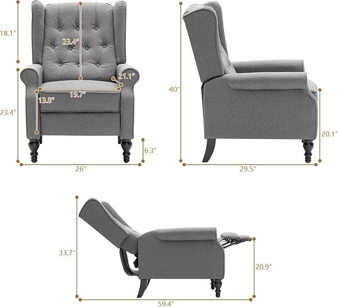- 【🎁TWO-PURPOSE RECLINER】Accent recliner chair or lounge chair. The backrest could be 105 degrees or 140 degrees. When the chair is upright, the angle between the back and the seat is 105 degrees, and the chair is in a fully reclined state, the angle between the back and the seat is 140 degrees.High back:23''. Item Size: 26"Wx29.5"Dx40"H, Seat Size: 20"Wx21"Dx20"H