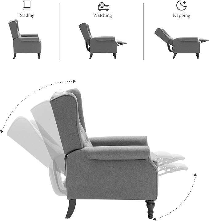 - 【🎁PUSH-BACK RECLINER】This recliner is a push-back recliner that allows you to lie down and relax after a long day. Simply lean back to tilt the chair and the footstool will pop out to provide a comfortable position for your feet. Just press the footstool down with your feet and the chair will restore its original shape.