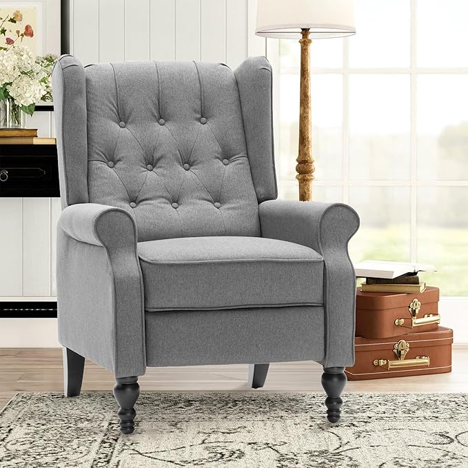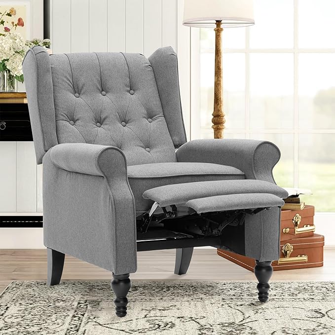 Mid Century Wingback Recliner Chair for Adults, Modern Linen Fabric Push Back Recliner Chairs with Button Tufted Upholstered Back & Footrest, Manual Recliner Chais for Living Room, Nursery, Gray