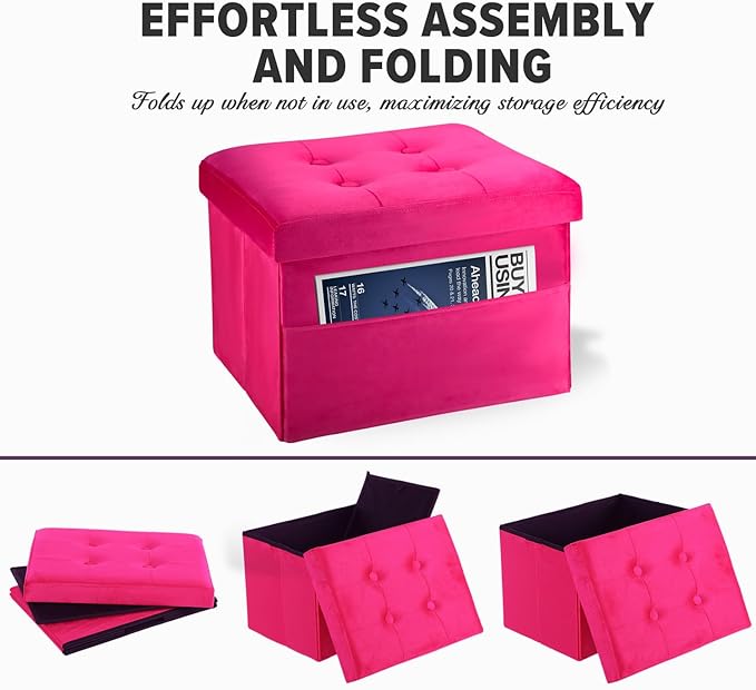 LINMAGCO Storage Ottoman Folding Foot Stool Foot Rest with Side Pocket Modern Ottoman with Storage Short Sofa Stool Velvet 17x13x13(ROSEO)
