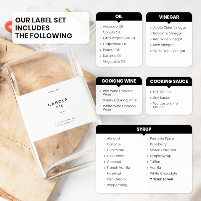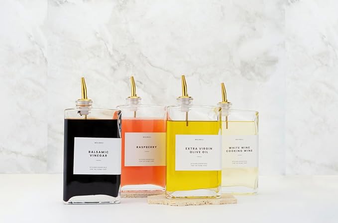 - Modern Kitchen Essential: Minimalism Inspired Cooking Oil Dispenser Bottle. This Set Includes Two High-quality 11.8 Oz (350 Ml) Glass Bottles, Two Gold Pourers, a funnel, and a 37 Label Set.