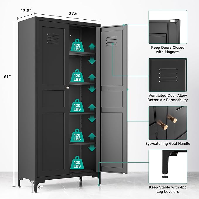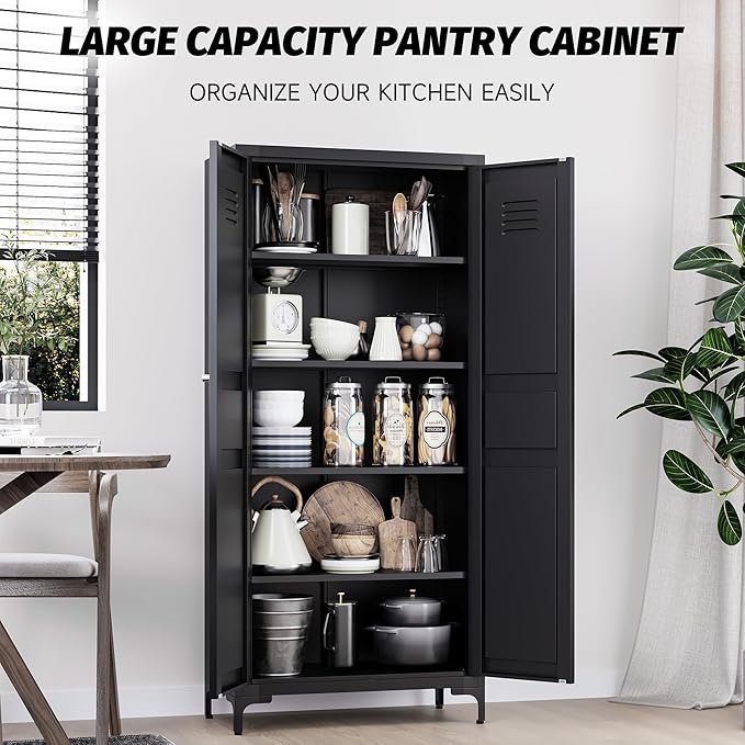 Metal Storage Cabinet with Doors and Shelves,Black Storage Cabinet with Leg,Metal Pantry Cabinets,Ventilated Pantry Closet,Tall Large Cupboard for Home,Kitchen,Dining/Living/Laundry Room