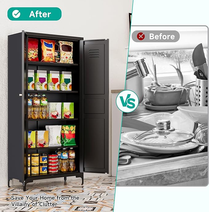 - ✔️☆【Sturdy,Durable and Safe】: Made of powder-coated steel plate, this Black pantry cabinet is sturdy,durable and easy to clean.Load capacity is up to 120lbs each shelf. The included anti-tip kit helps secure the pantry cabinets to the wall to give you a safer living space.