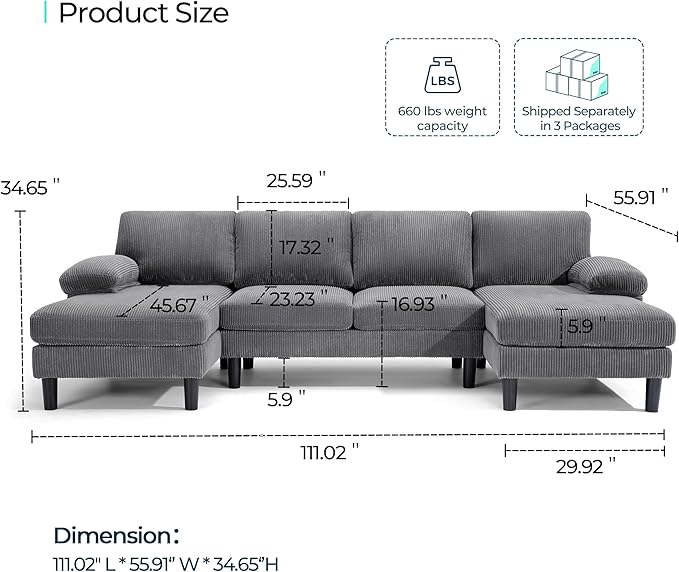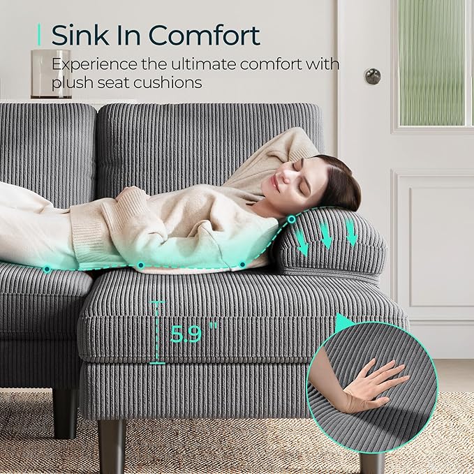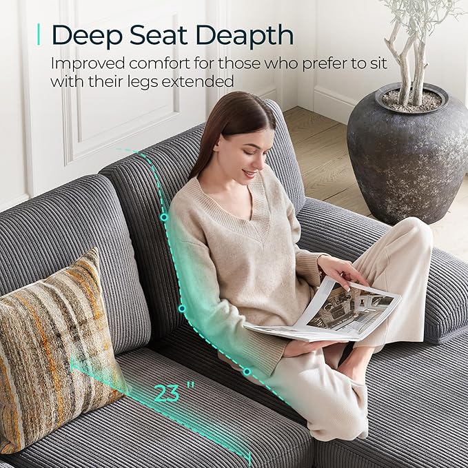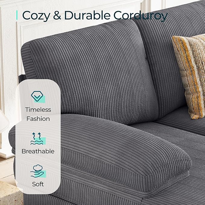 - 【Luxurious Corduroy Fabric】 - Upholstered in premium corduroy fabric, this large reversible couch combines elegance with comfort. The soft, textured fabric enhances the overall aesthetic of your living room while ensuring durability and resistance to wear and tear