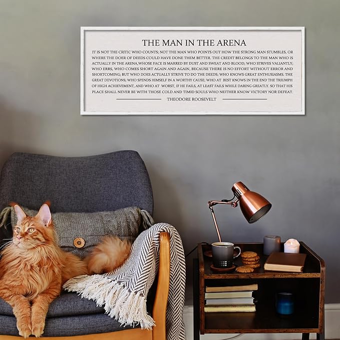 LuZhiQiang The Man in the Arena Wall Decor 40''x15'' Inspirational Quotes Office Wood Framed Sign Rustic Home Motivational Art For Man Entrepreneur Morden Living Room Wall Hanging Decor (White)