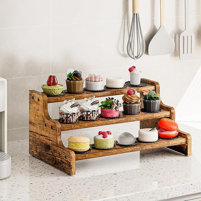 - VERSATILE STORAGE: This 3-tier wooden step shelf provides ample storage space for spice bottles, jars, seasonings, and baking supplies in your kitchen pantry or cabinet.