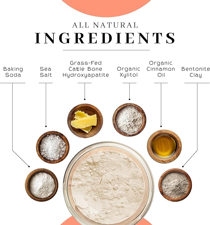- Power Packed Ingredients - Our mineral tooth powder includes grass-fed cattle bone hydroxyapatite, bentonite clay, xylitol, pure cinnamon oil, baking soda for cleaning teeth, and sea salt for removing impurities