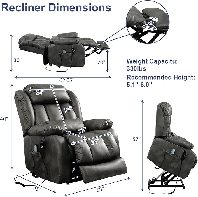 - [Upgraded Size] Our power lift recliner has a longer footrest and thicker backrest with double lumbar cushion design, which can provide you with a more comfortable using experience. In addition, the footrest has been extended by 3", which can more fully support your feet when you recline in the chair to read or rest, allowing you to get a more ultimate experience.