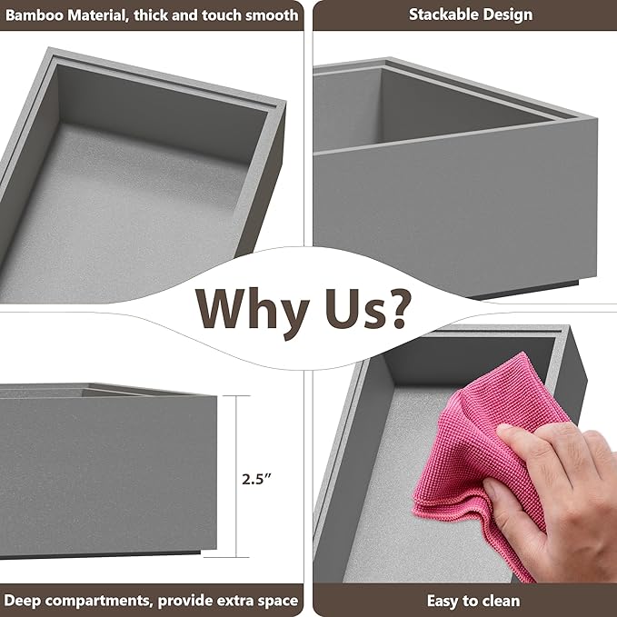 - Stackable and Deep Drawer Organizer Bins - Greatseas bathroom tray features 2.5" in height, which gives you more space to storage your guest towel, toilet paper roll, makeup and perfume. With groove design, our toilet tank tray can be stacked as needed. Its deep compartmentments and stackable design make it a practical storage box for drawers or even countertop, protecting your item from falling