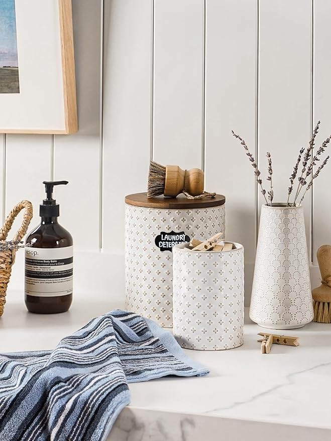 - Embossed Design: Featuring an arctic white glaze with a charming embossed pattern, these farmhouse-style ceramic jars will add warmth and vitality to your home. Their elegant design complements various home styles, making them the perfect addition to your countertop or coffee corner. Enhance your homeβs aesthetics and let these jars become a standout decorative element in your living space