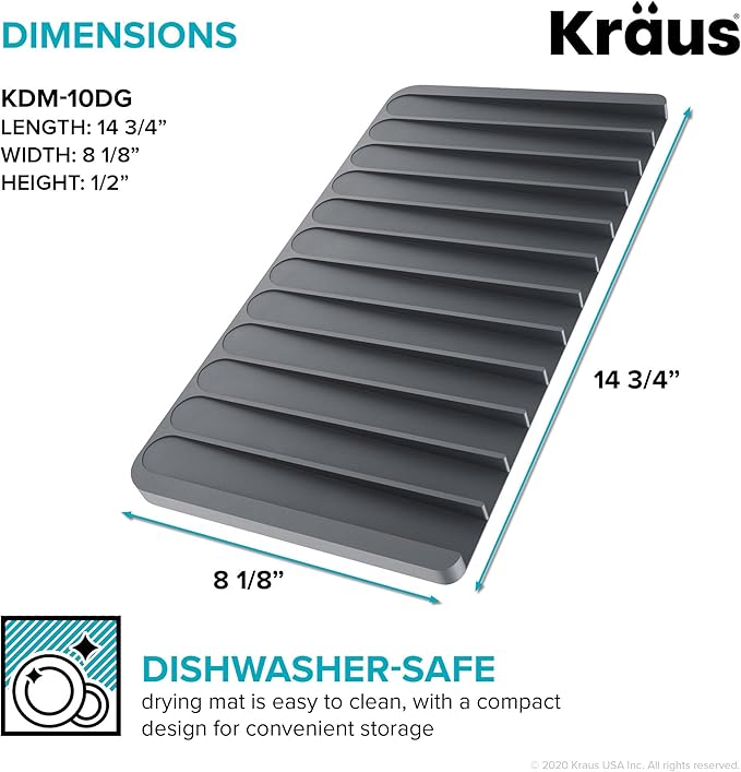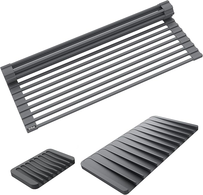 Kraus Roll Up Dish Drying Rack with Self-Draining Silicone Dish Drying Mat and Silicone Soap Dish Holder in Dark Grey, KDM-KRM-10DG