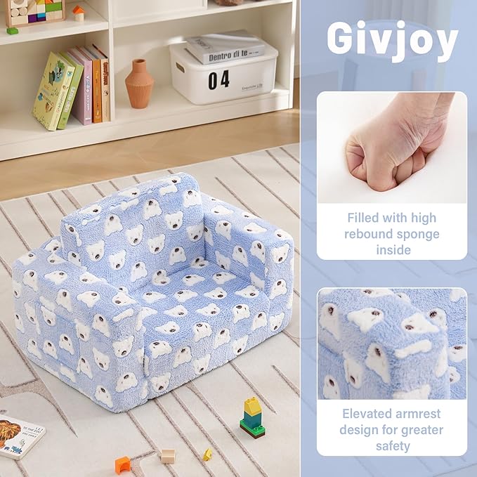 - 【Multifunctional 2-in-1 Design Unique Present for 18 months+ Boys and Girls】The 2-in-1 children's sofa couch is a wonderful present for all kids & toddlers on Birthdays, Christmas, or other occasions! Your child will find this small kids' couch a perfect spot for relaxing, reading, playing, or enjoying their favorite TV shows. Meanwhile, with both modern design and fashionable colors, this small couch can fit any room and add great vitality to your house.