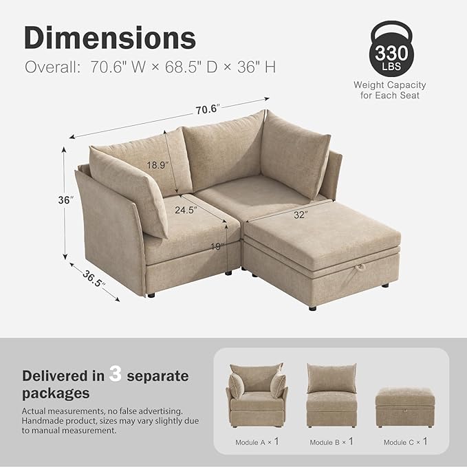 - š” Stylish and Spacious Sectional Sofa - A blend of modern elegance and comfort, this beige sofa is ideal for contemporary interiors. Customize seating and shape by adding or removing modules to fit your needs. It's perfect for your living room, family room, bedroom, or office. Overall size: 70.6" W Ć 68.5" D Ć 36" H, seat width: 32", seat depth: 24.5".
