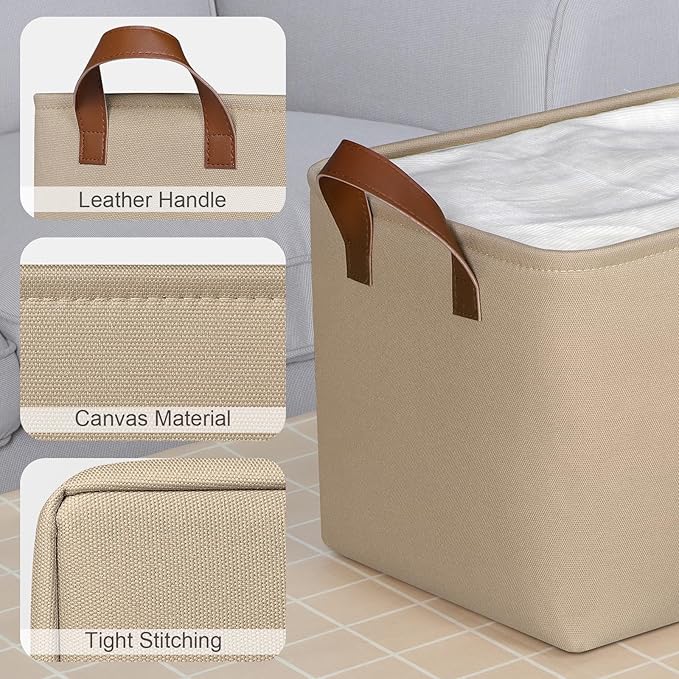 - 【Sturdy Construction】Our storage baskets for shelves are reinforced with upper metal frame and fiberboard bottom to keep basket shape and upright. With the 2 leather handles securely sewn to the sides of the fabric bins, provides a comfortable grip while ensuring that you can easily carry items without tearing the handles.