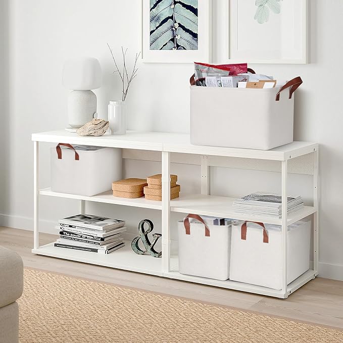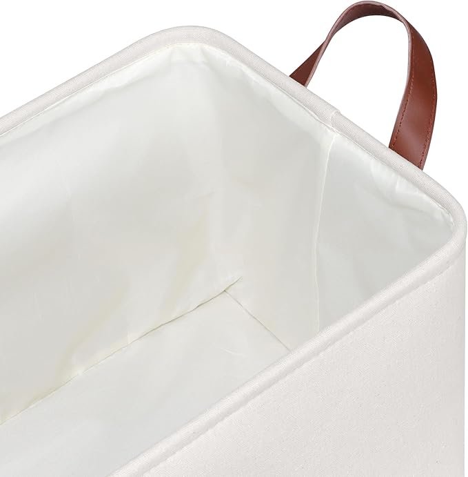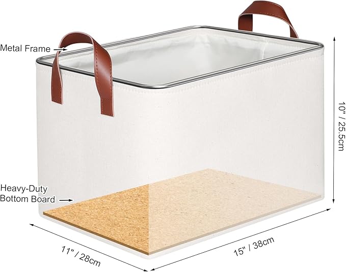 - 【Sturdy Construction】Our storage baskets for shelves are reinforced with upper metal frame and fiberboard bottom to keep basket shape and upright. With the 2 leather handles securely sewn to the sides of the fabric bins, provides a comfortable grip while ensuring that you can easily carry items without tearing the handles.
