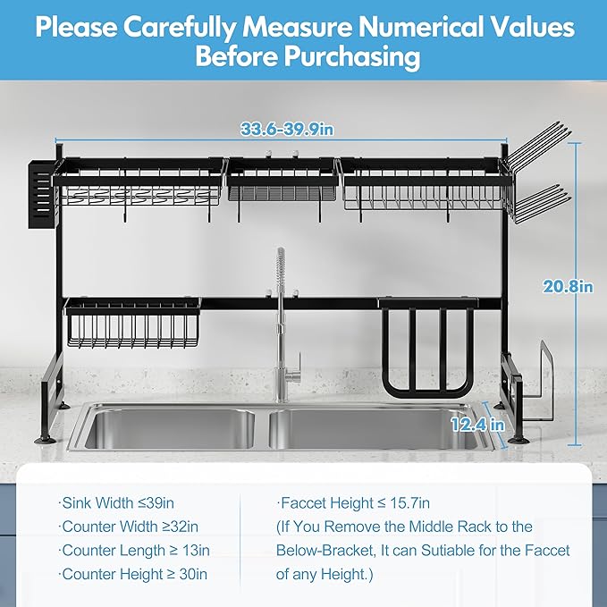 - Fit for the Faucet of Any Height: If you remove the middle rack to the below-bracket, this sink drying rack can suitable for the faucet of any Height. Beside, the size is 33.6 - 39.99 (L) *12.4 (W)*20.8(H) inches.