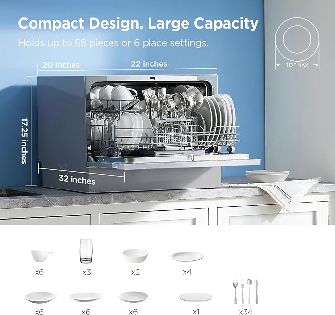 - 6 Place Setting- A perfect size (H17.25″×W22″×D20″) for 2-3 people. Midea compact dishwasher is suitable for dorms, RVs, and apartments. This countertop dishwasher can fit up to 70 pieces of tableware and has a plate size of up to 10 inches in diameter. Note: Midea dishwashers are tested at the factory before they are shipped. If your new dishwasher has some water inside, this is normal.