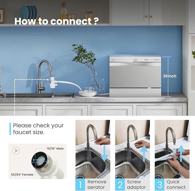 - Simple Installation- Midea portable dishwasher can be connected to faucet directly (Suitable adaptor needed). Depending on your needs, it can be flexibly placed on the table or fitted in the cupboard.