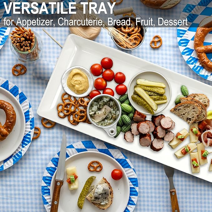 - Versatile Trays - These white minimalist plates are perfect for most serving needs. Serve appetizers or deserts for celebrations, carry snack or fruits on the picnic, use for charcuterie platters, use as bottle/ spices holders to make kitchen neat and well organized