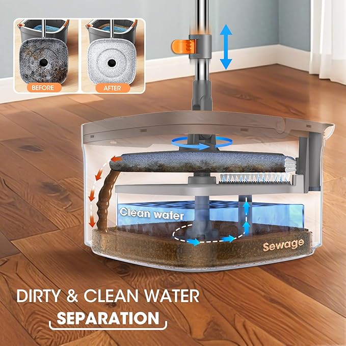 - Clean Water and Sewage Separation System: Different from the traditional mop system, BOMIDI mop and bucket with clean water spinner not only removes hair and dirt, but also separates clean water from dirty water, ensuring only pure water touches your floors. The mop system only needs a little water to clean your floors, saving water
