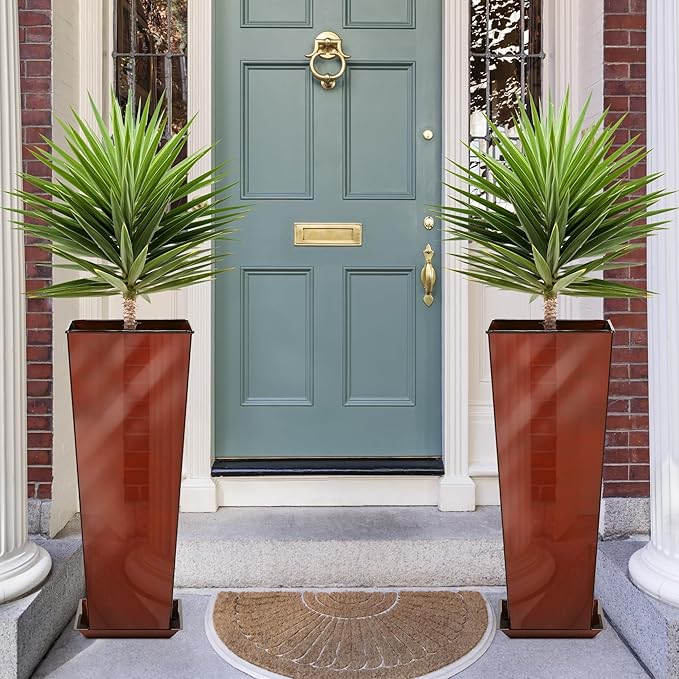 KOL 28''H. Tall Galvanized Steel Glazed Planter with Saucer, Set of 2, Planter Pots with Insert for Indoor & Outdoor Use, Decorative Flower Plant Pots for Front Porch, Patio, Deck - Reddish Brown