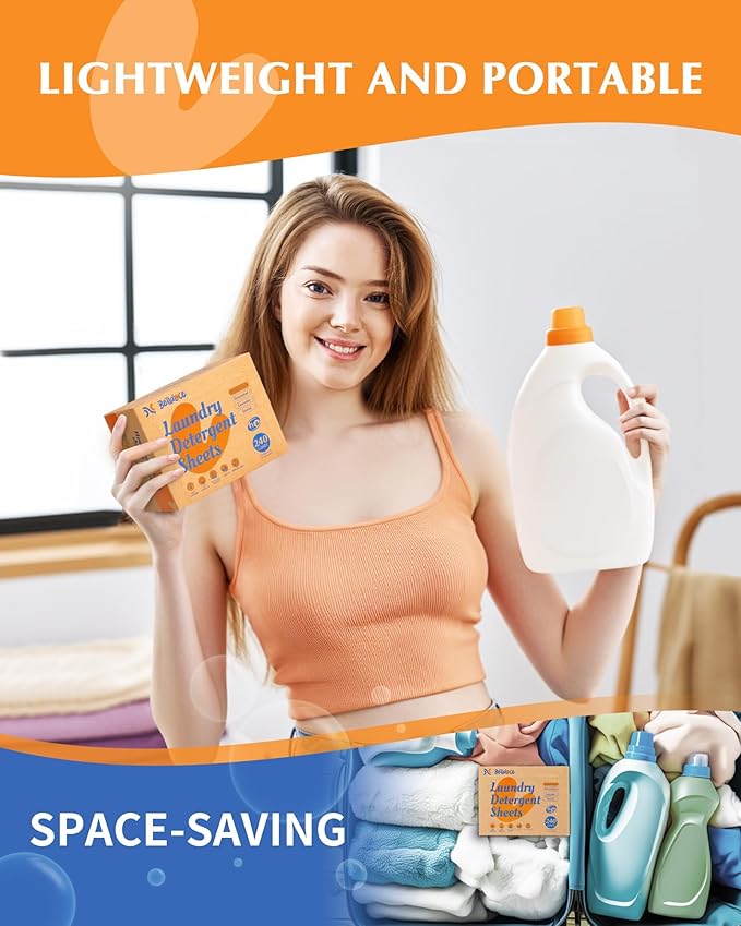 - SPACE-SAVING & PORTABLE - Saves time and space with our compact laundry detergent sheets. Each sheet is packed with cleaning power, eliminating the need for bulky bottles or jugs. Whether you're traveling or simply looking to declutter your laundry room, our detergent sheets are the convenient solution you've been looking for.