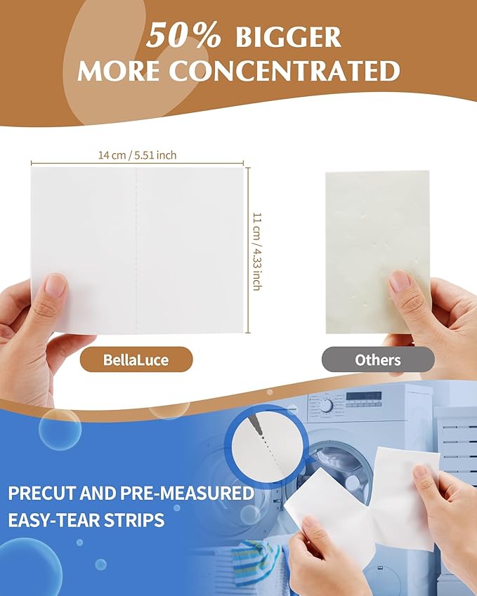 - SAY GOODBYE TO MESS AND SPILLAGE - Bellaluce laundry sheets simplifies your laundry routine with our innovative laundry detergent sheets. They are pre-cut and pre-measured to avoid overused. No more measuring liquid or dealing with messy spills.