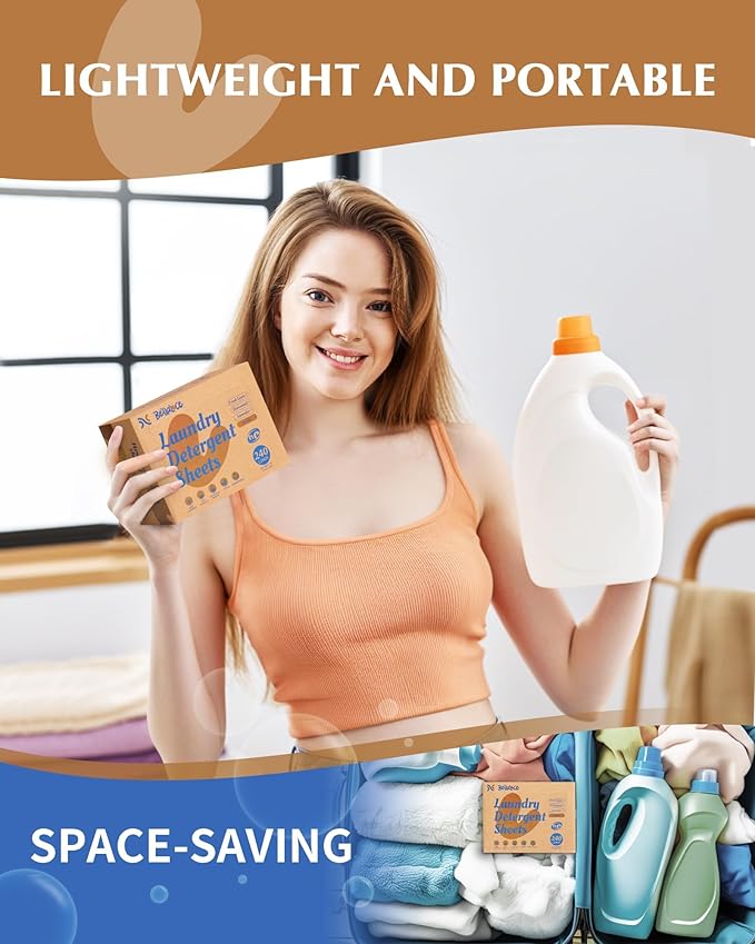 - SPACE-SAVING & PORTABLE - Saves time and space with our compact laundry detergent sheets. Each sheet is packed with cleaning power, eliminating the need for bulky bottles or jugs. Whether you're traveling or simply looking to declutter your laundry room, our detergent sheets are the convenient solution you've been looking for.