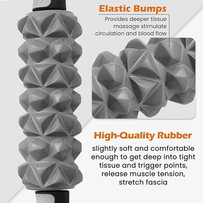 - For Relaxation: Dual grips with textured surface rubber on each grip for more stability and comfort when holding and using. The massage stick elastic bumps provide deeper tissue massage, stimulate circulation and blood flow