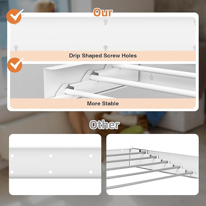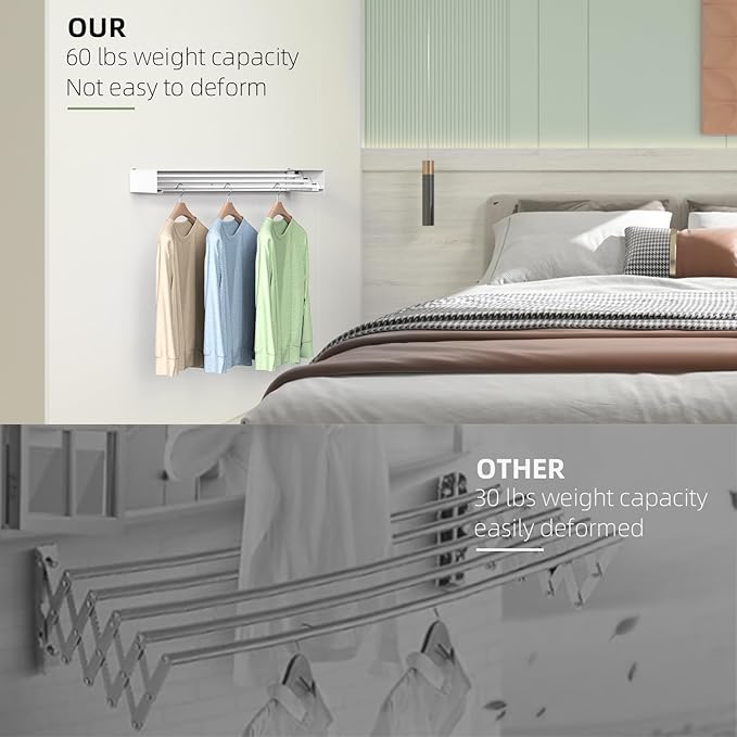 - Heavy Duty & Sturdy: 5 drying rods of the collapsible clothes drying rack are made from premium stainless steel, noticeably thicker and more robust than the standard silver pipes seen in the market, without risk of bending or deformation. 60lbs Capacity. This clothes dryer rack takes up little room, but when open you can fit so much! Compact yet functional.