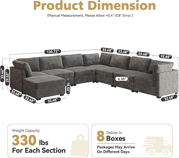 - One Package Per Seat:The modular sofa comes with 8 boxes and may arrive at different dates. Each box is designed and packaged to maximize shipping efficiency and fits narrow staircase and elevator. Armchair Size: 32.7" W x 28" D x 33.5" H; Ottoman Size: 32.7" W x 32.7" D x 18.5" H. Weight Capacity: 330 lbs / Seat. There may be slight color differences due to light or monitor.