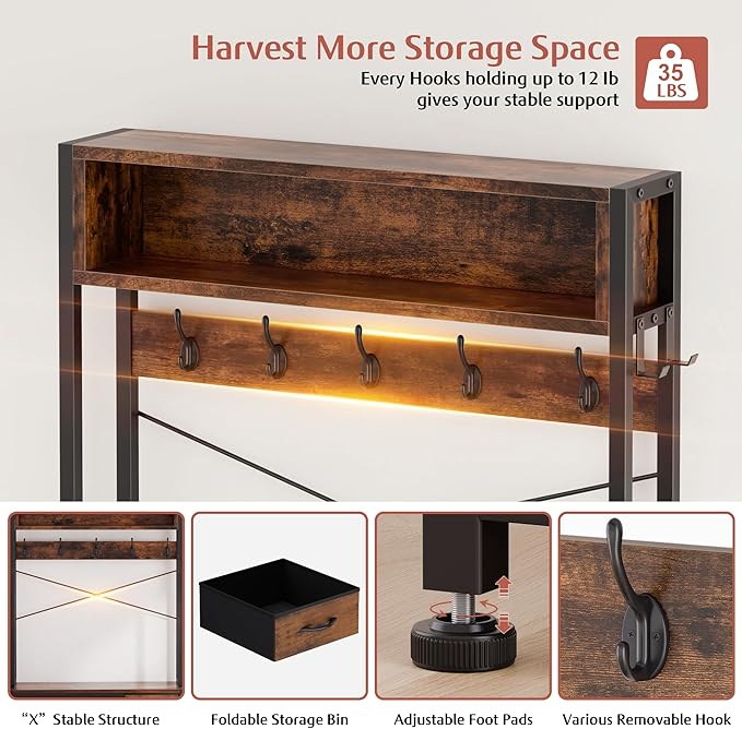 - Stable and Safe: Adjustable foot pads are equipped at the bottom so that entryway coat rack can stand perfectly stable on carpets or uneven floors. Meanwhile, the hall trees with an X rack and 2 anti-tips allow the whole more safe to prevent it from falling and keep safety of the family. After 15-20 minutes of installation, then have a multi-functional coat and shoe rack.