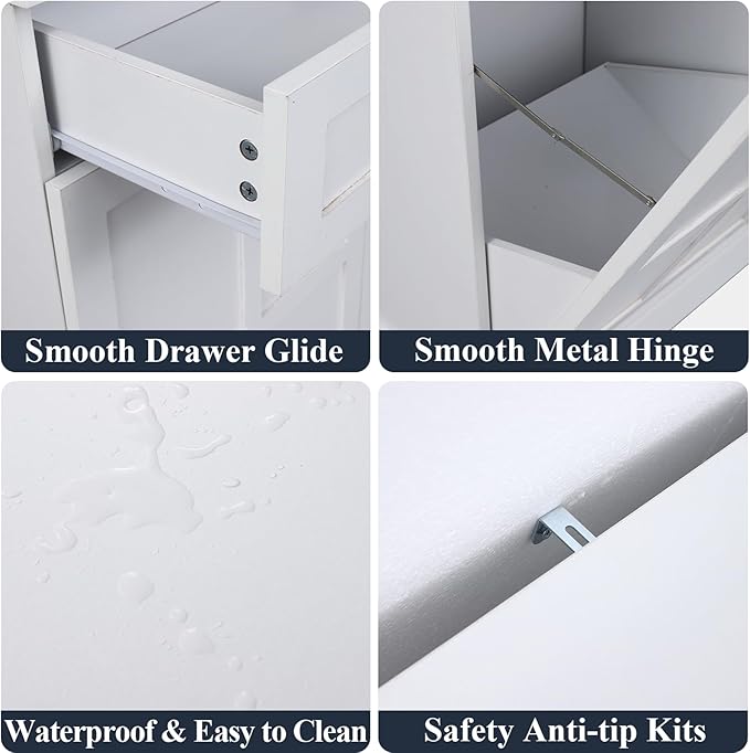 - 【Sturdy & Stable Construction】Featuring premium MDF and sturdy metal hinges, this tilt out laundry cabinet provides excellent stability and solid support to ensure long-lasting use. The top can hold up to 110 lbs. The top 2 drawers come with guide rails that glide with ease, making it easy to open and close. This laundry cabinet has an elevated base to ensure your items stay dry even when there is water on the floor. It also comes with an anti-tilt kit that you can mount on the wall for added stability.