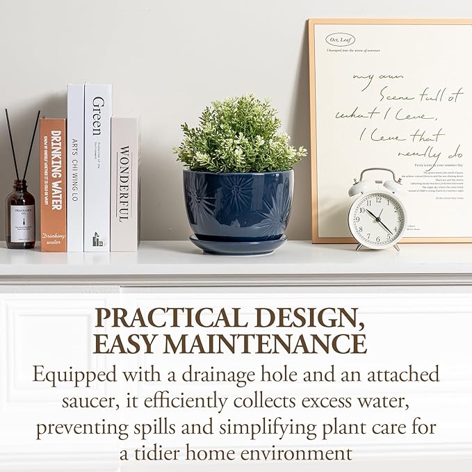 - Modern blue ceramic empty pot with embossed sunburst design, drainage hole and attached saucer dish provides a sophisticated home for any houseplant