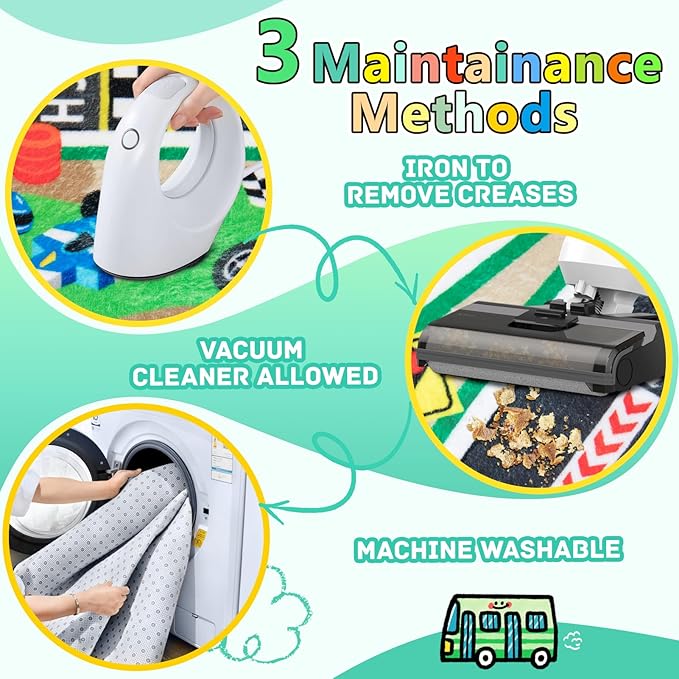 - [About Creases & Thickness]: Due to vacuum package, the road map rugs for kids may feel thinner and have wrinkles after right unpacking. Please don't worry, it will take 3 to 7 days for the kids rug to regain its original shape. You could also use a steam iron to smooth out creases caused by shipping folds.