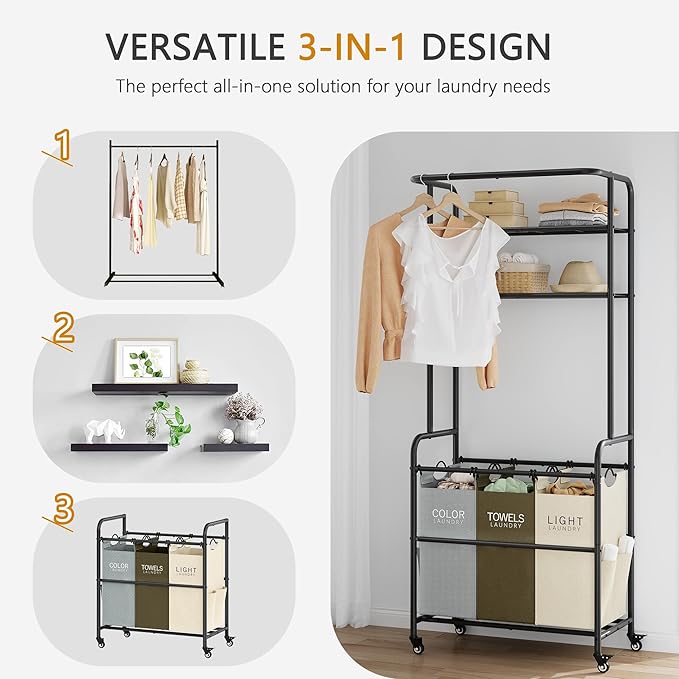 Laundry Sorter 3 Section,Laundry Hamper Cart with Hanging Rack & Removable Bags,Heavy Duty Laundry Basket Organizer with Wheels & 2 Tier Shelf,3 Colors