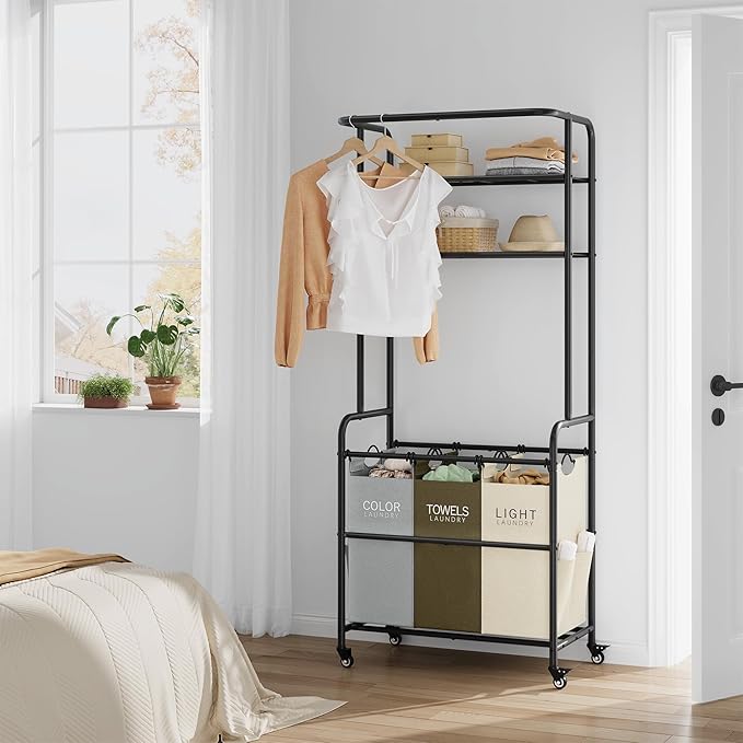 - Heavy Duty Frame: The Laundry Sorter with Hanging Bar is made of sturdy metal frame with black glossy anti-rust coating to ensure durability. In addition, it comes with extra side pockets for you to store other items