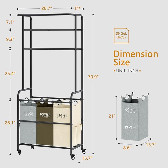 - All-in-One Laundry Cart: Measuring 29.13"L x 16.14"W x 70.86"H, the laundry hamper with shelf features 3 laundry bags for easy sorting, shelves to store essentials, and a sturdy hanging bar for drying or hanging clothes