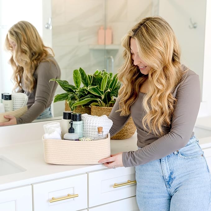 - Safe, Natural Cotton Organizer Bins: Crafted from the highest quality material in the market, our storage bins are oh-so-sturdy (and cute) and ready to take on little humans. They’re 100% safe, so you can rest easy if teething toddlers take a nibble. Reinforced Hidden Handles: Now you see ‘em, now you don’t! With completely hidden handles that blend seamlessly into the rope basket, you’ll be the Houdini of home organizing. They’re even double-stitched and reinforced for extra heavy loads!