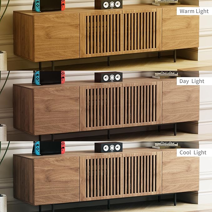- 【High-Quality & Durable Materials】: Crafted from premium fiberboard with a real wood veneer surface and solid white ash wood slatted doors, this TV stand is built to last. Its sturdy internal structure and quality hardware ensure it remains stable over time, resisting deformation or cracking while maintaining its visual appeal.