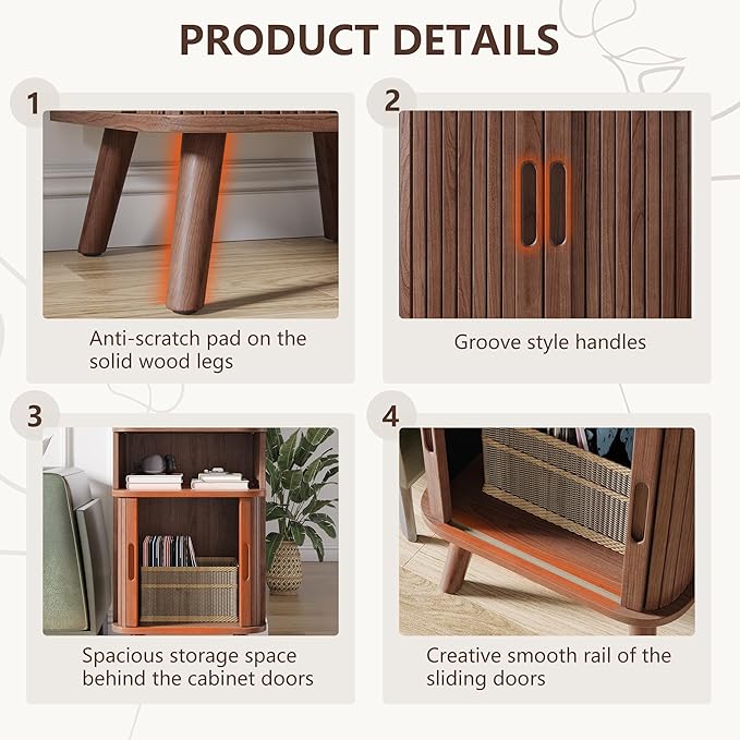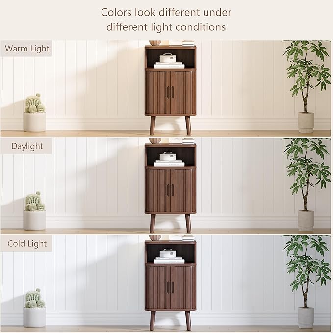 - 【Space Saving Design】: Due to our unique guide rail design, the slatted tambour doors of the end table can be easily and smoothly moved left and right - the slide door is a real way to save more space. This end table with storage combines stylish, practicality, and fun, it will be a perfect addition to your living room, bedroom and home office.