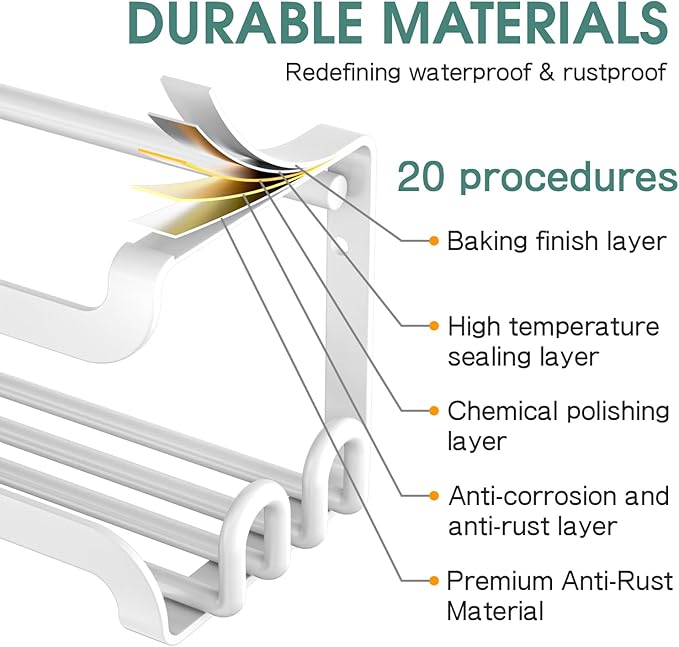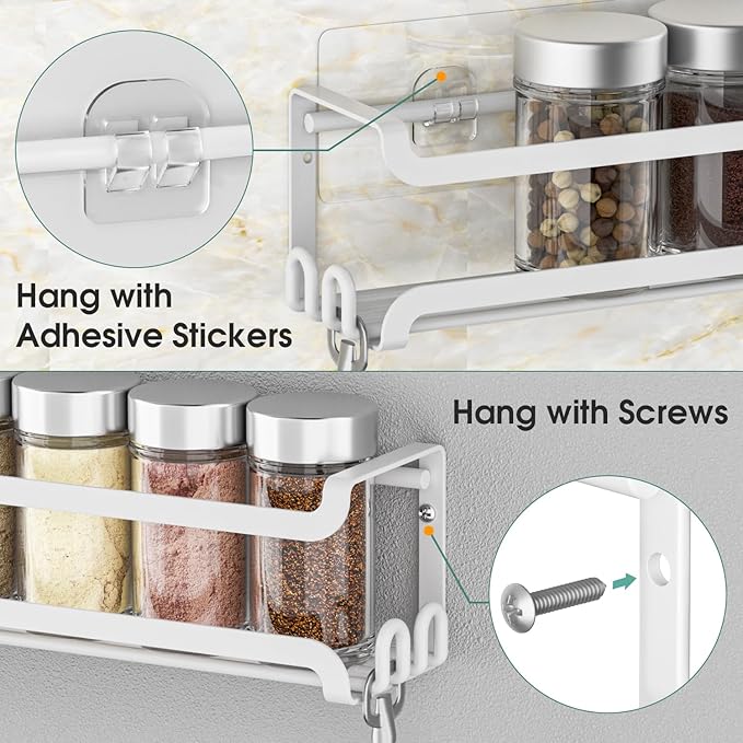 LUCYCAZ 2 Pack Wall Mounted Spice Rack with 16 Hooks, Spice Organizer Shelf for Stove Cabinet Pantry Door,Screw or Adhesive Spice Shelf Hanging Wall Spice Rack in Kitchen and RV (White, 2 PACK)