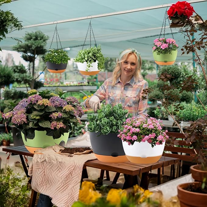 - 【Ventilation and Drainage】The bottom of the planter has a porous design for proper ventilation and drainage. for effective drainage and ventilation. This, combined with the mesh-like structure at the base of the 8 inch self-watering hanging pots, ensures optimal aeration. Suitable for plastic hanging baskets for plants, this design promotes well plant respiration.
