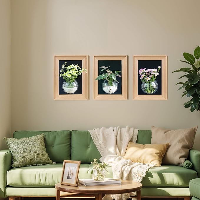 Natural Wooden Frame Wall Hanging Planter for Hydroponic Plants, 12'' x16''inch Wall Vase with Round Acrylic Propagation Station,Bathroom, Office, or Living Room Décor, Set of 3