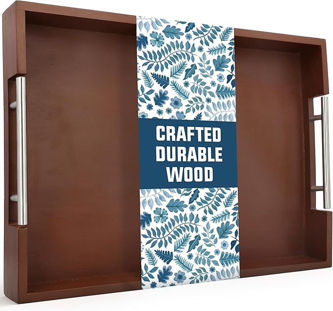 - Multi-Purpose Wooden Tray - Serve breakfast in bed, carry drinks, or create a charcuterie board with this 17x13" Acacia wood tray. Its light mahogany brown finish and sturdy handles make serving effortless and elegant.